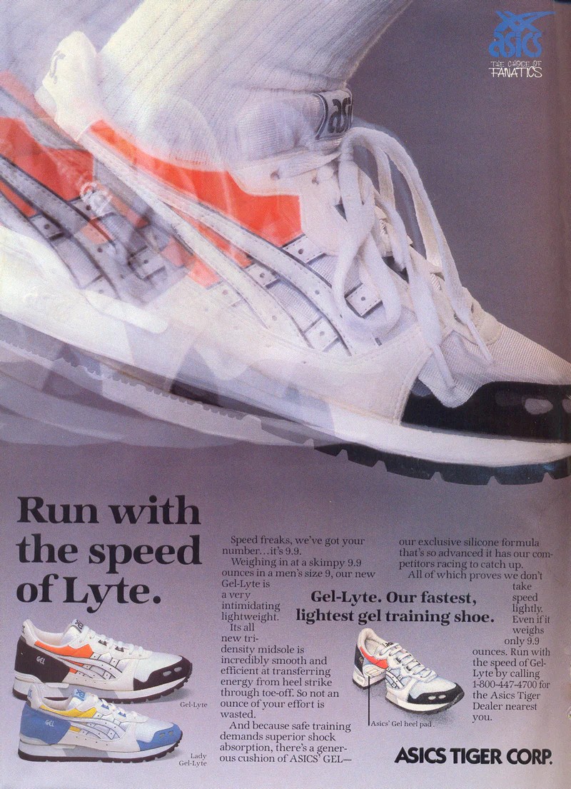第二年,亚瑟士Gel-Lyte登陆美国,这是一款仅重9.9盎司的鞋款,是当时最轻的跑鞋,配合强势的广告攻势,以及后续的几款Gel Lyte上市,亚瑟士基本确立了在北美严肃跑圈中的地位。